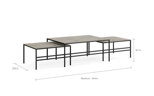 Close-up front view of the Anton Nesting Coffee Table from by Crea, featuring a minimalist black steel frame and durable Dekton top, styled with modern decor in a neutral interior. Close-up front view of the Anton Nesting Coffee Table from by Crea, featuring a minimalist black steel frame and durable Dekton top, styled with modern decor in a neutral interior.