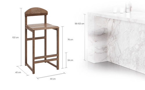Ted bar stools in dark oak with wooden backrests against a sleek marble kitchen island, showcasing modern Nordic design.