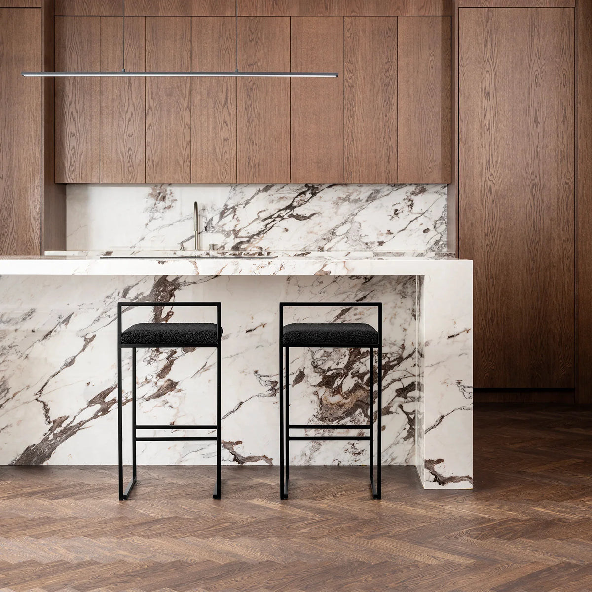 Freja bar stools in black leather against a marble kitchen island backdrop, showcasing minimalistic design and style.Freja Bar stool - Black - Jade black leather