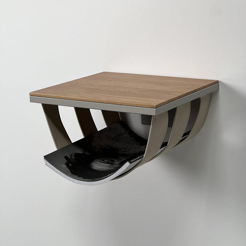 Lisa wall shelf in black frame with dark oak top and black leather, adding modern elegance to any space.