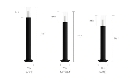Scandinavian black floor candleholders with glass cylinders beside a wooden cabinet in a stylish room setting. Scandinavian black floor candleholders with glass cylinders beside a wooden cabinet in a stylish room setting.