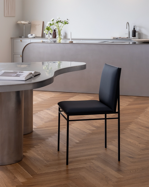 Sella dining chair in black leather beside a modern wooden table, enhancing elegance in contemporary dining spaces.Sella dining chair in sleek black leather, adding modern elegance to any dining space.