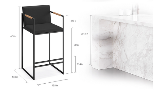 Bruno bar stool in black velvet at a modern kitchen island with marble countertop and wooden cabinets.