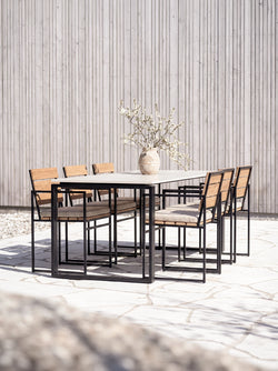 L’usage en extérieur laisse des traces avec le temps, et c’est tout à fait normal. L’acier inoxydable et les surfaces thermolaquées sont choisis pour mieux résister à l’usure quotidienne, à la chaleur, aux taches et aux UV, avec peu d’entretien. Un nettoyage régulier reste toutefois essentiel. Le teck, lorsqu’il reste dehors sans protection, se patine progressivement et prend naturellement une teinte grisée.
