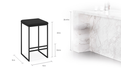 Svea bar stool in black leather with a sleek metal frame, set against a modern marble countertop.