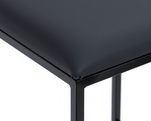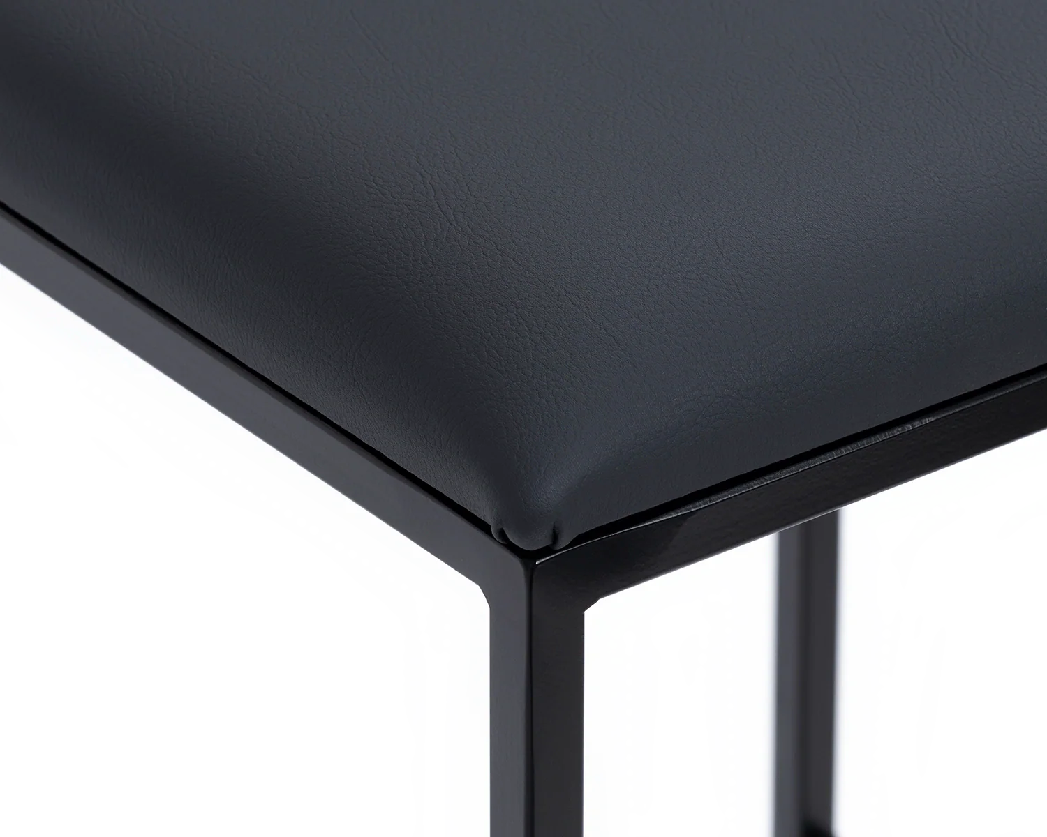 Freja bar stools with black leather cushions at a marble kitchen island, featuring a sleek black frame and minimalistic design.