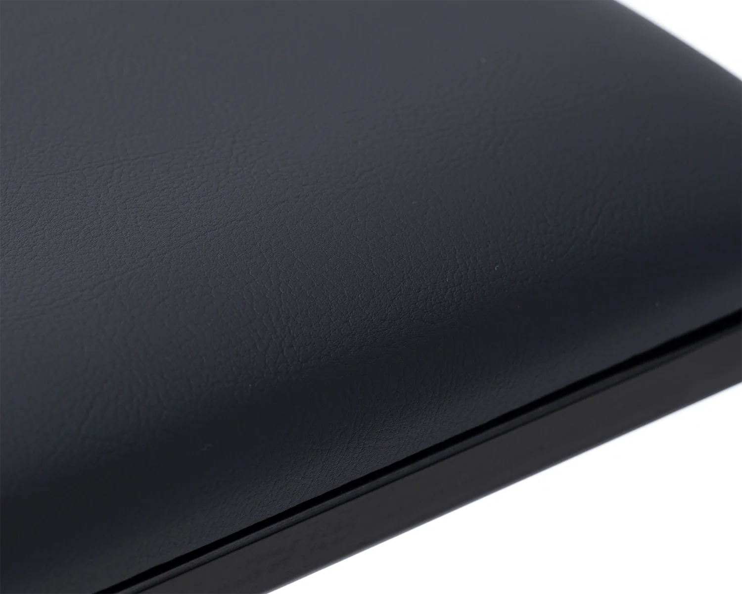 Freja bar stools in black leather with minimalist design at a modern kitchen island with marble countertop.