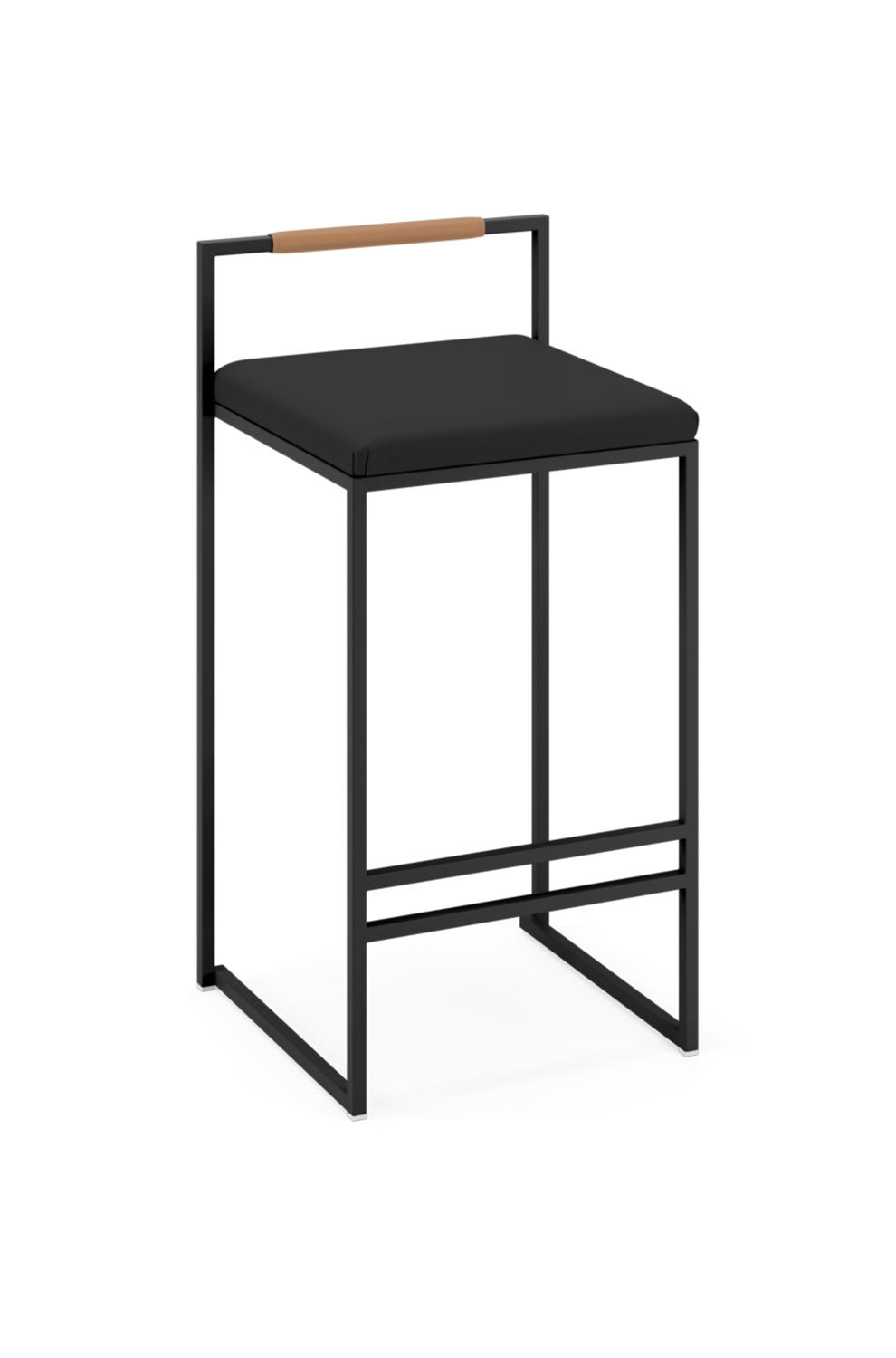 Freja bar stool in black with leather cushion at a stylish kitchen island, showcasing minimalistic design.